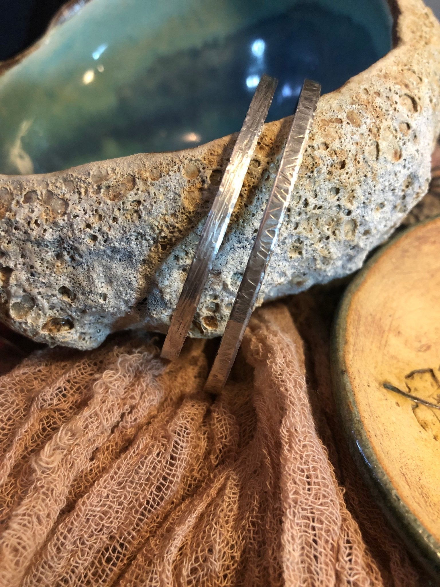 A testament to timeless craftsmanship and elemental strength. These textured bangles embody the raw energy of the earth, featuring a unique hand-hammered finish that ensures no two are alike. Crafted from recycled sterling silver, they offer a sustainable yet bold statement. Perfect for stacking or wearing solo, these bangles are designed to withstand the test of time, both in durability and style. Wear them as a reminder of your own enduring strength and connection to the primal forces that shape us.